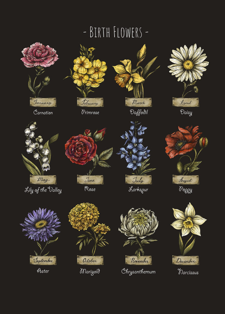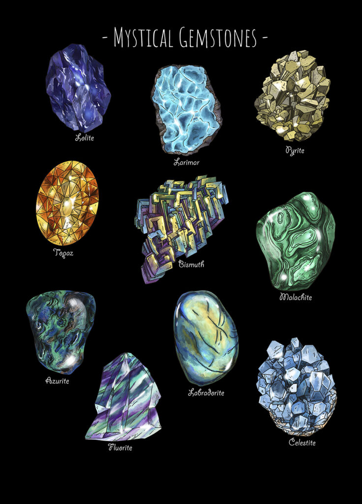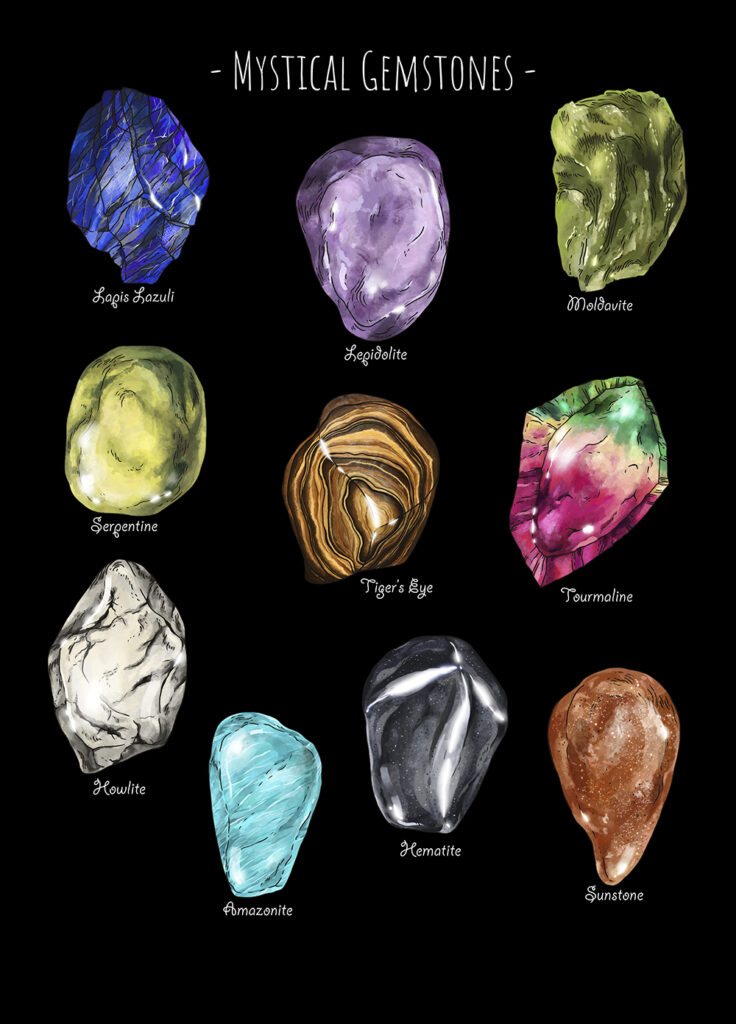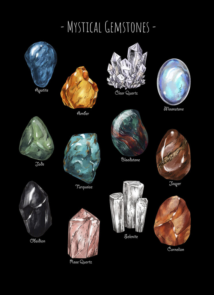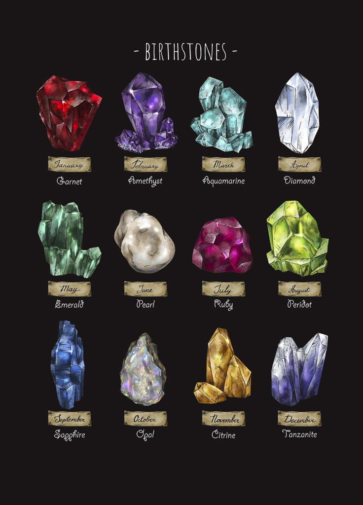Vintage birthstones, Months gemstone, witchcraft magic illustration, wicca elements