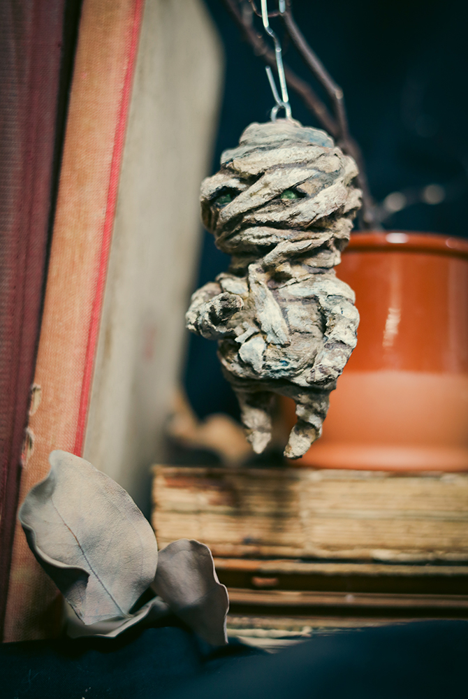 OOAK Spun Cotton Mummy Ornament with Green Crystal Eyes – Handmade Collectible Halloween Decoration – Vintage Style Figurine