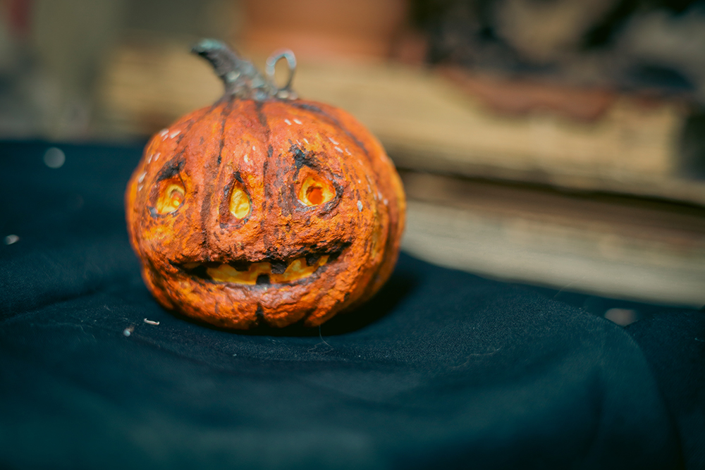 OOAK Spun Cotton Pumpkin Jack-o’-lantern Ornament with Orange Crystal Eyes – Handmade Collectible Halloween Decoration