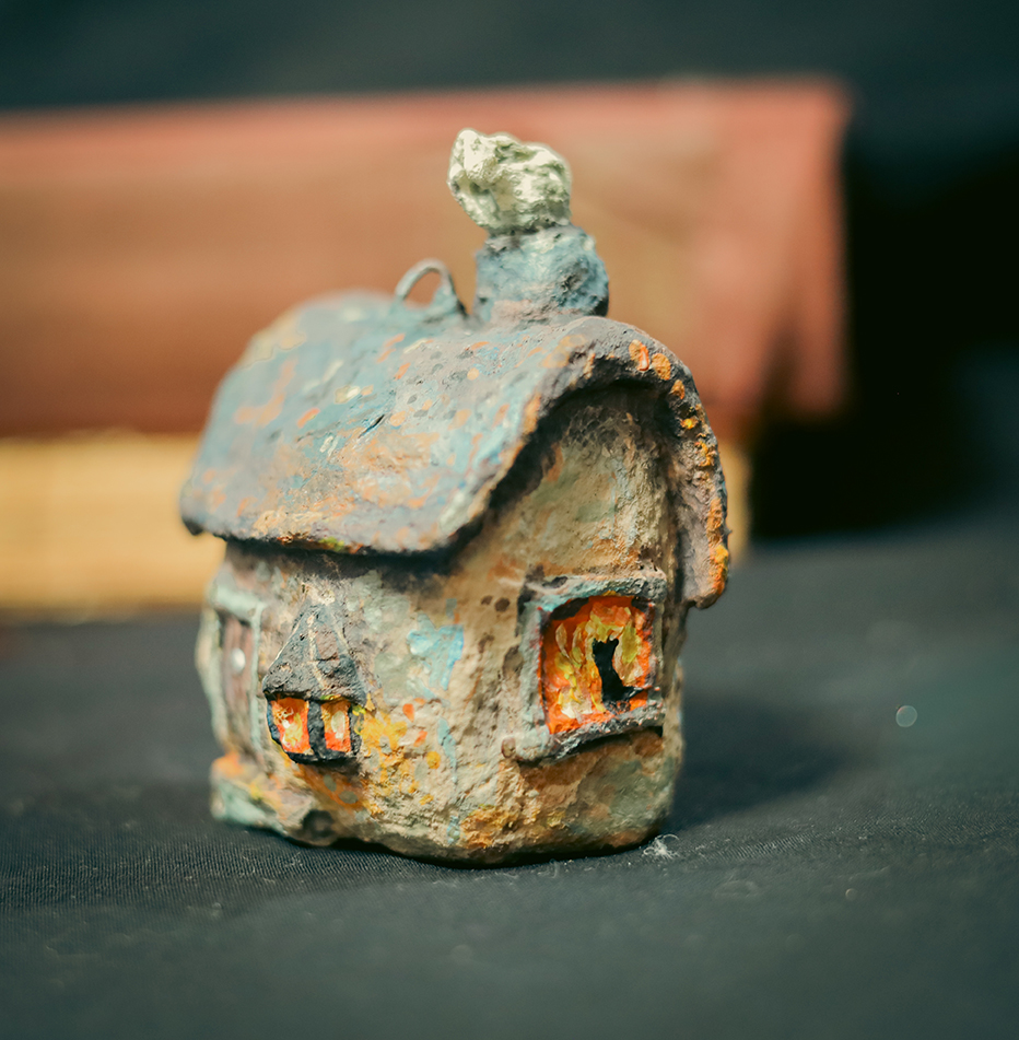 OOAK Spun Cotton Haunted House Ornament – Handmade Collectible Halloween Decoration – Glowing Windows & Cat Silhouette