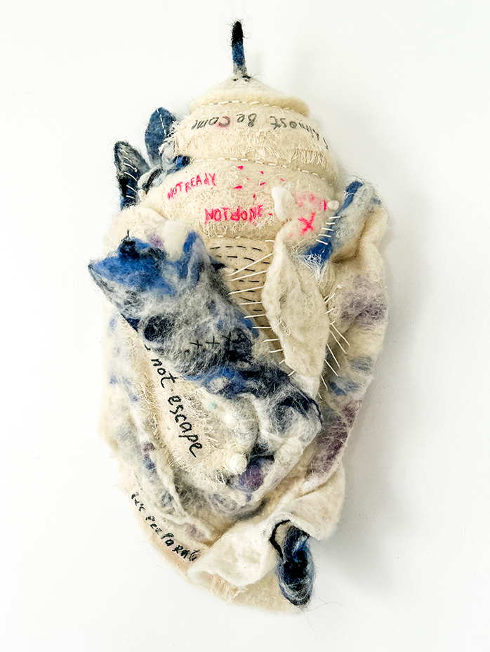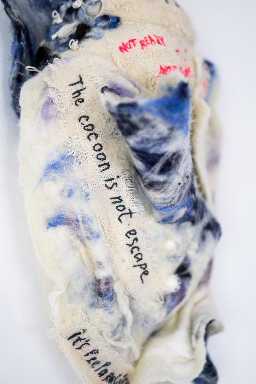 The asymmetrical organic form is decorated with embroidered words and fragments, giving the impression of hidden thoughts and emotions. Hints of wings press beneath the surface, breaking its symmetry, suggesting a body in quiet preparation. Hand-embroidered fragments — “not ready,” “I almost become,” — drift across the form like thoughts unspoken.