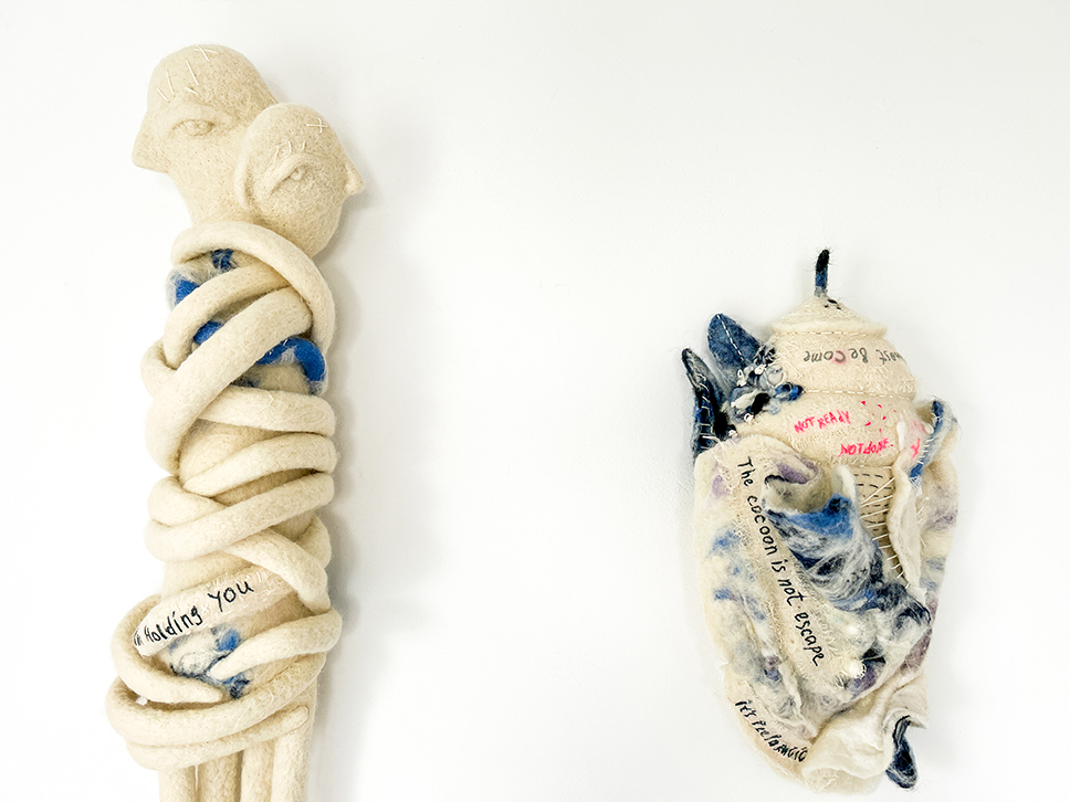 Handmade wall-hanging fiber art sculpture, created with wool, hollow fiber filling, and hand embroidery.