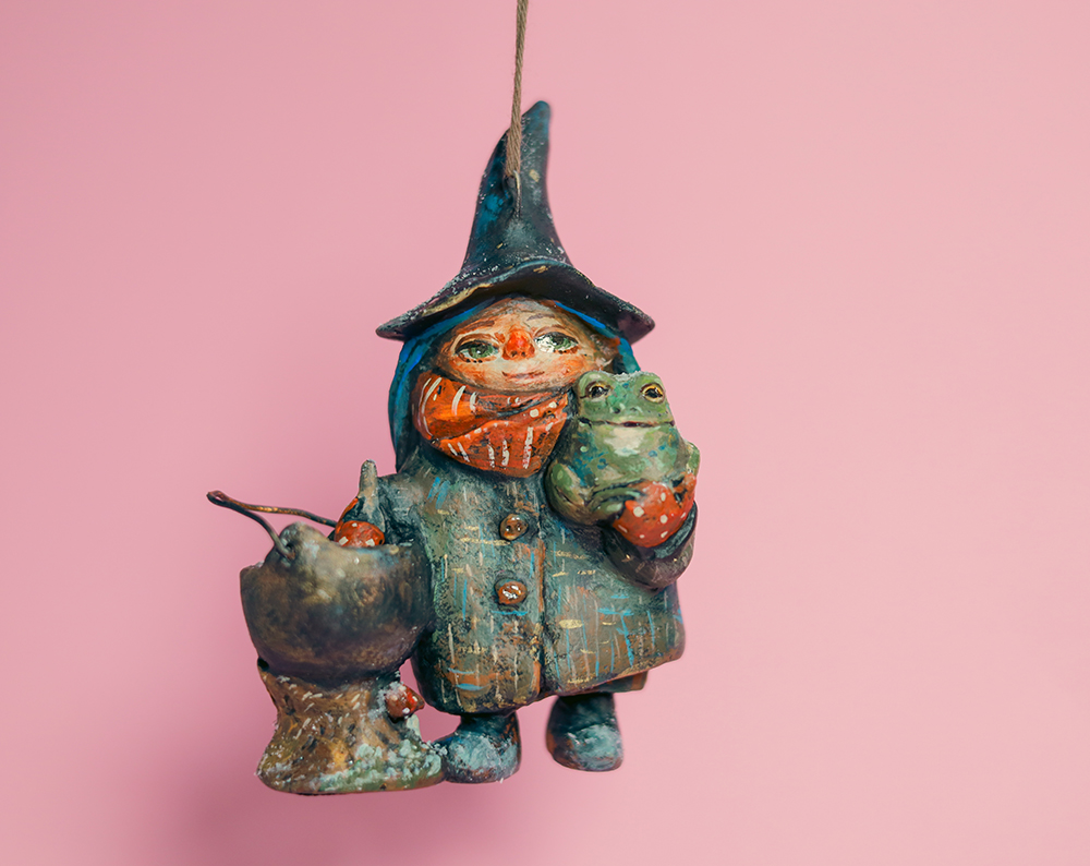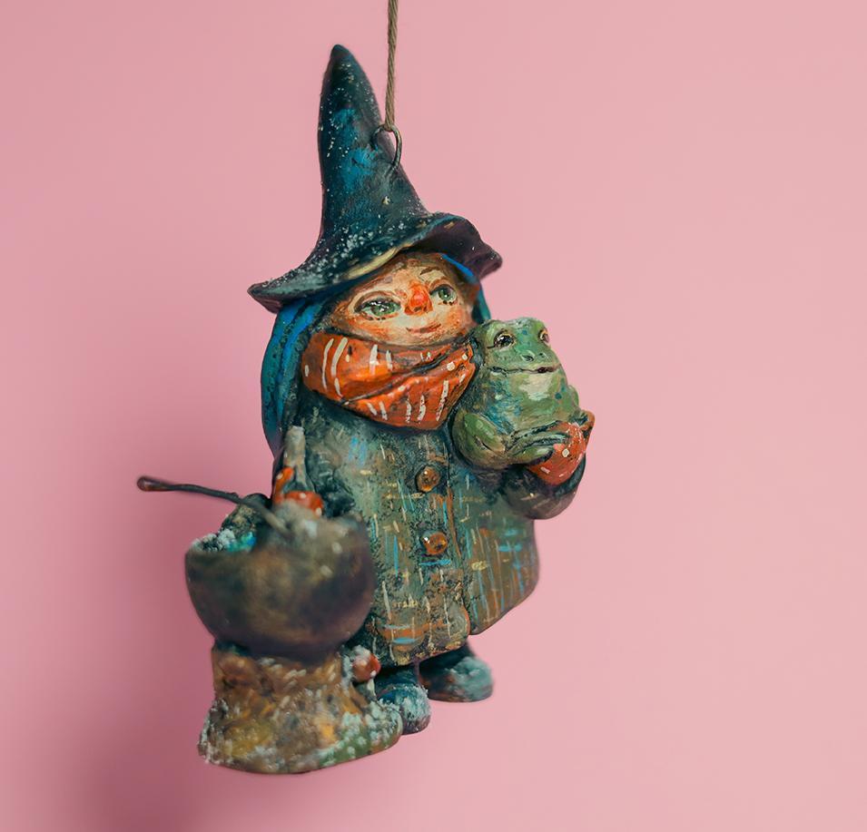 December 22, 2025BRISTLE — Hanging Witch Paper Mache Ornament with Cauldron & Frog
