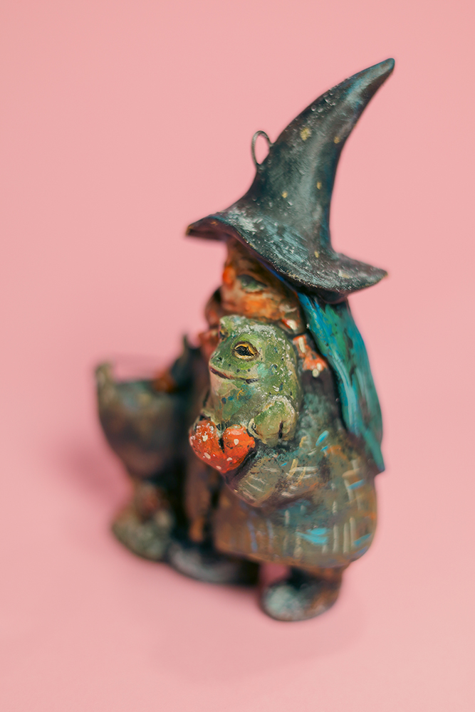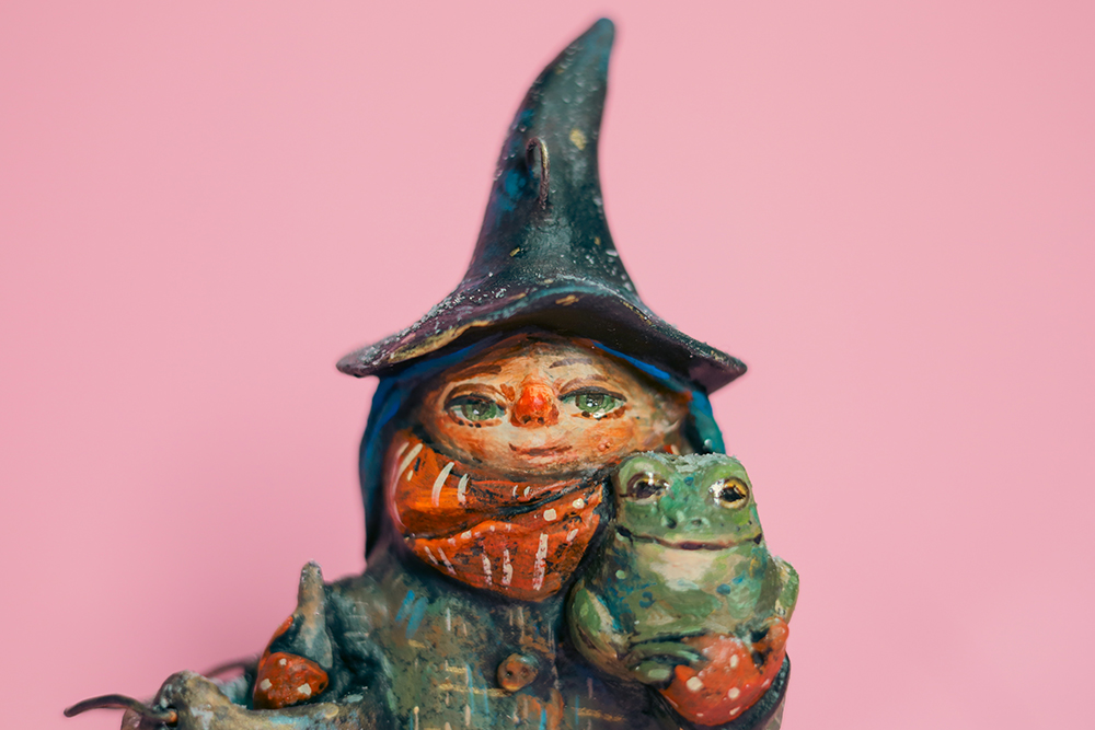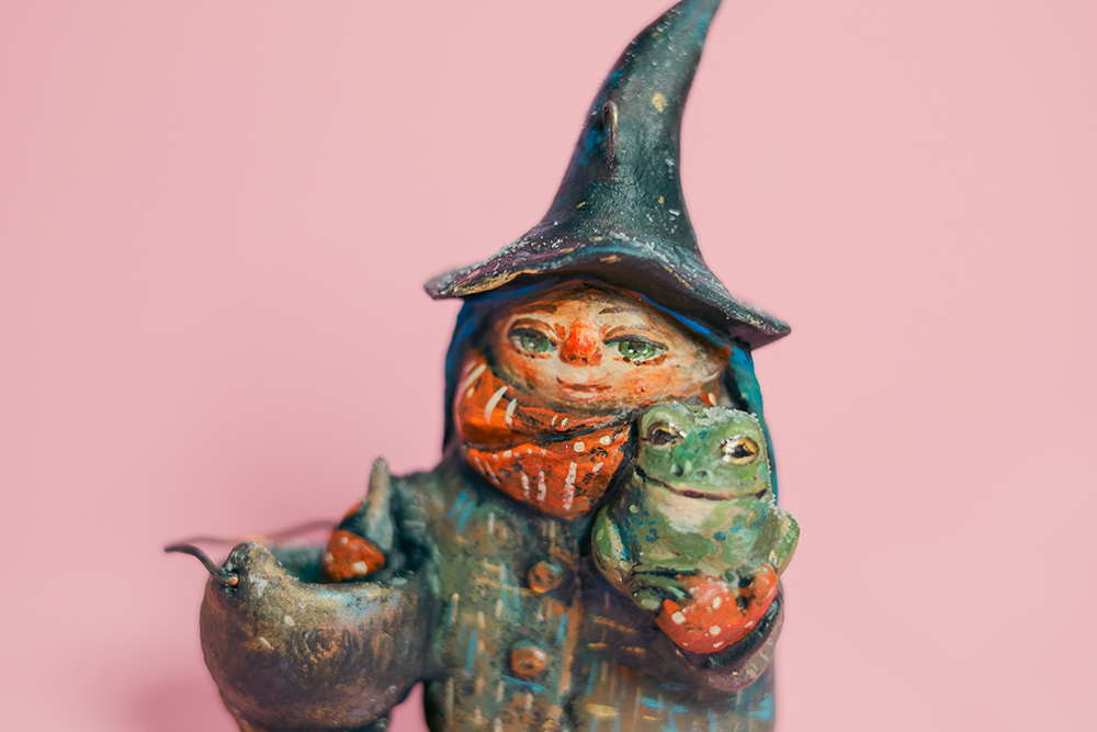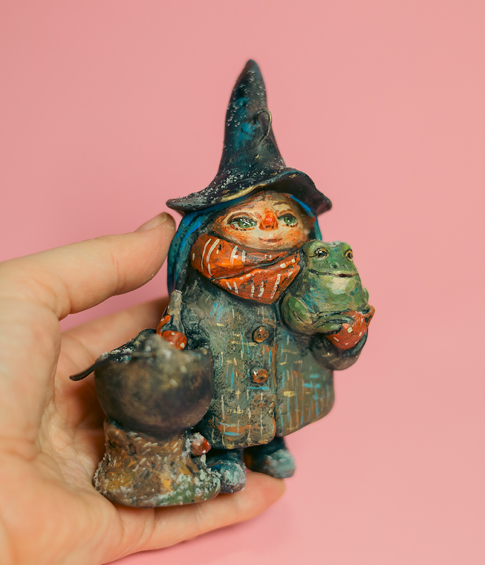 She doesn’t rush spells — she simmers them slowly, like a story that needs time to become true. Her little cauldron never boils too loudly, and the frog in her arms looks like he’s heard every secret in the house and kept them safe.