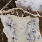 Hand-felted wool wall hanging – wet felting, needle felting and hand embroidery, hung on a natural wooden branch.
