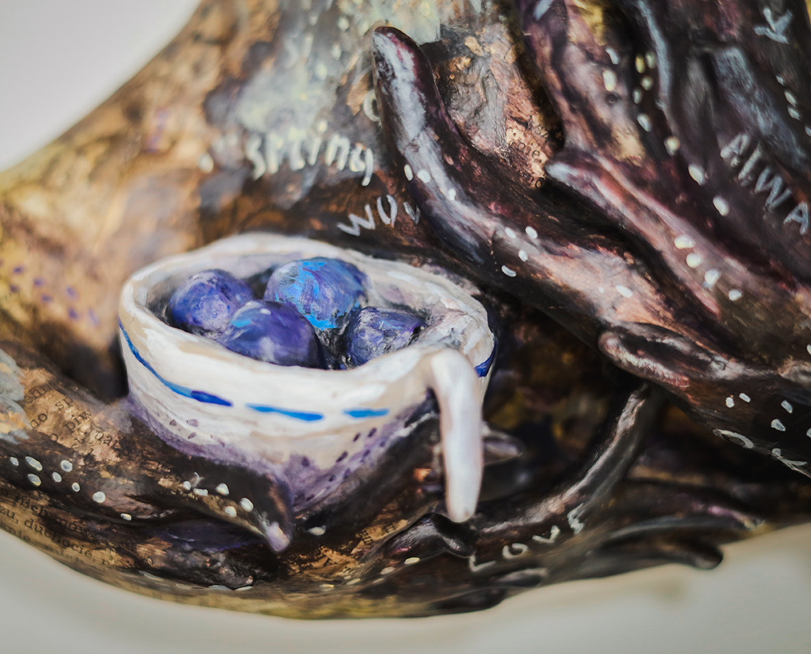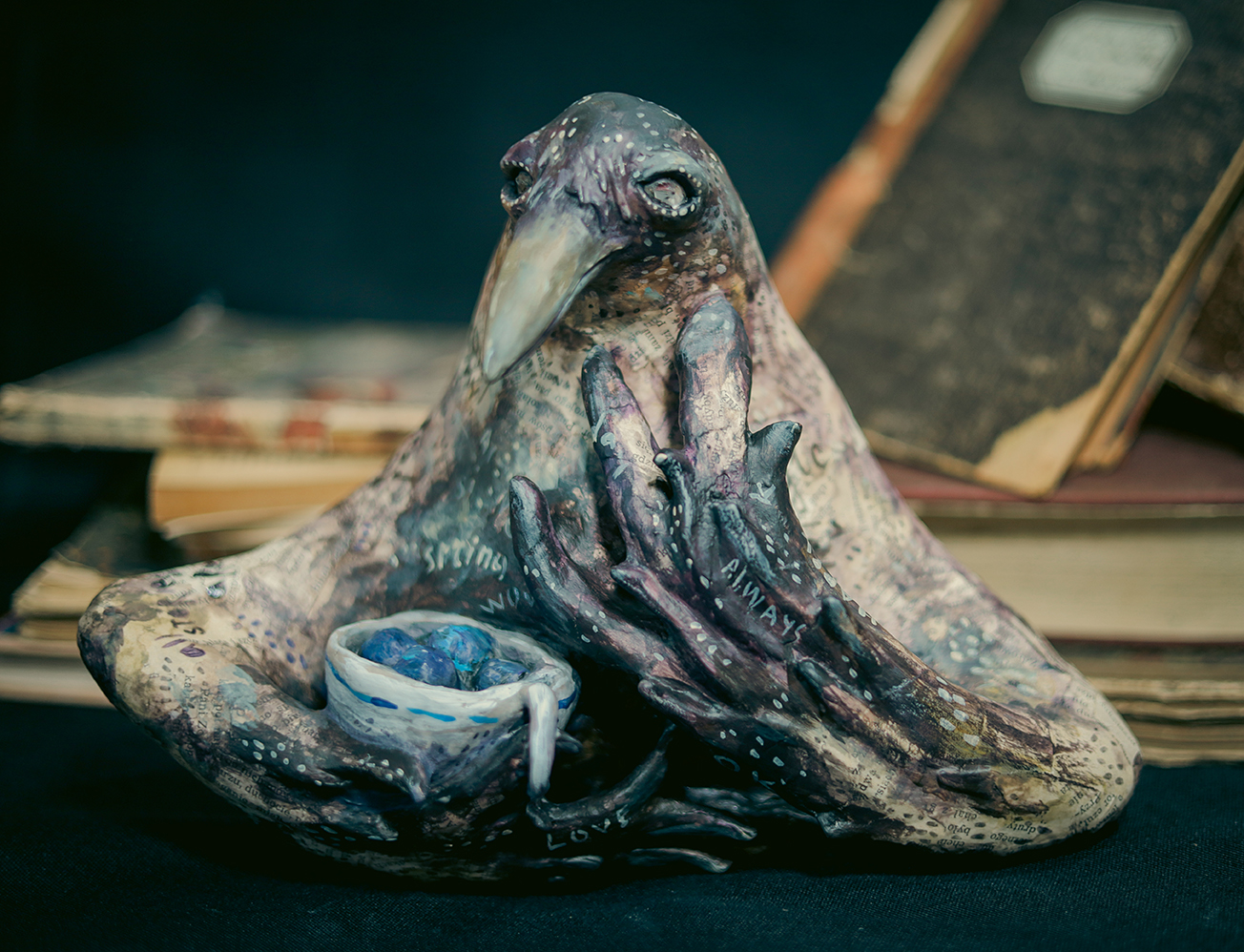The Blueberry Reader – a one-of-a-kind paper mache raven wall sculpture. Carefully handcrafted and covered in fragments of book pages and handwritten literary quotes, this wise companion holds a teacup brimming with blueberries – a symbol of comfort, memory, and quiet joy.