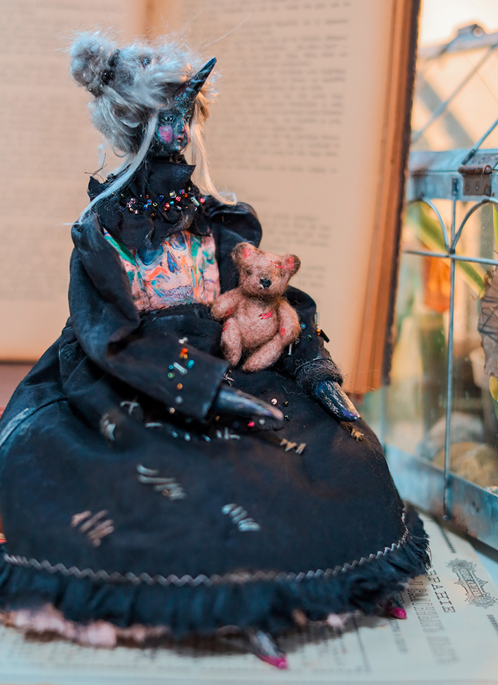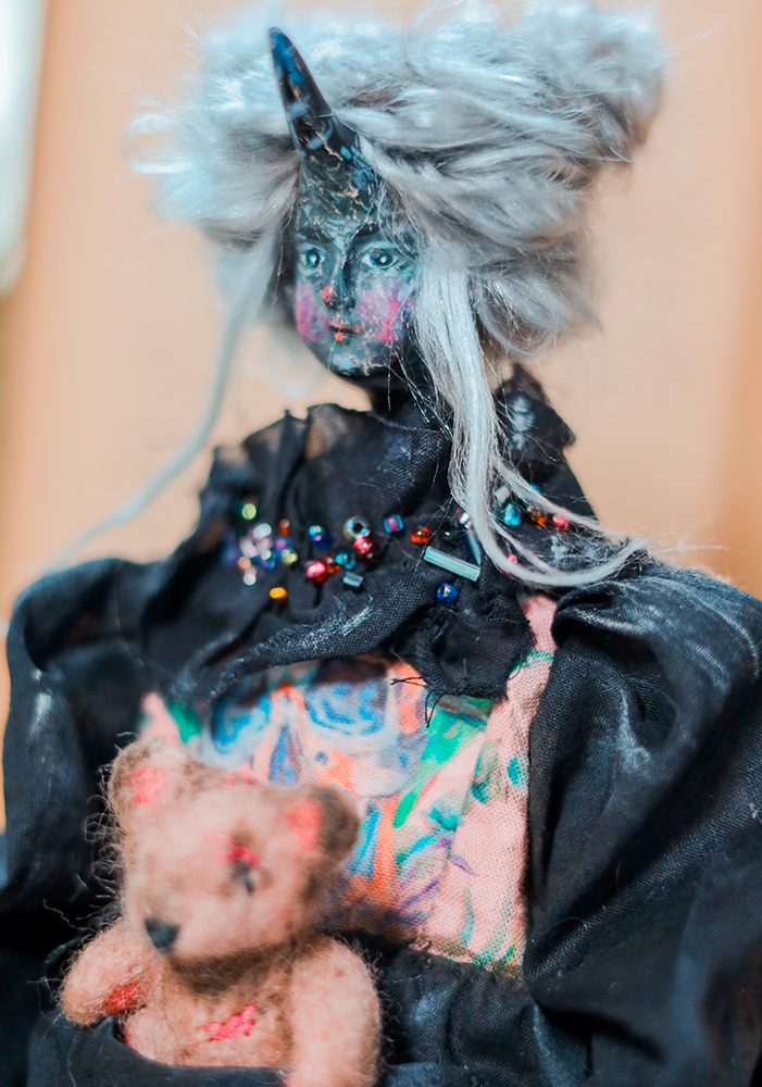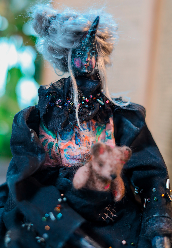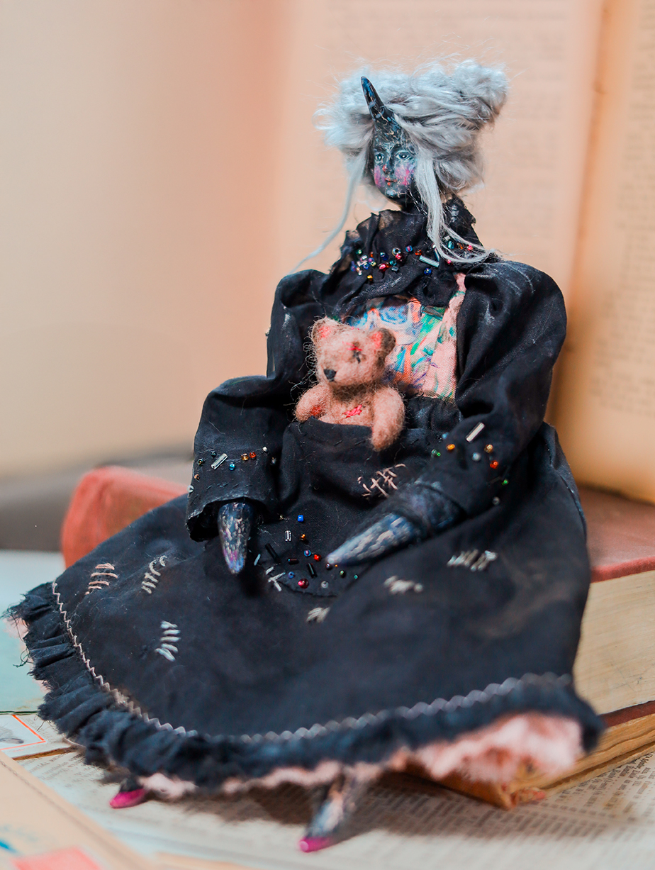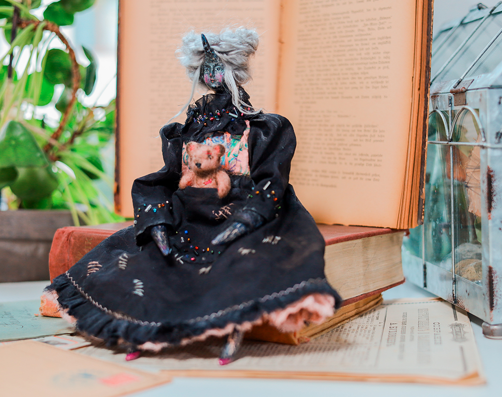 December 25, 2025A one-of-a-kind black unicorn witch doll, dressed in a timeworn black gown with delicate bead embroidery. Her dress carries subtle marks of age, while a tiny, well-loved teddy bear rests in her front pocket — a constant companion through shadows and quiet nights.