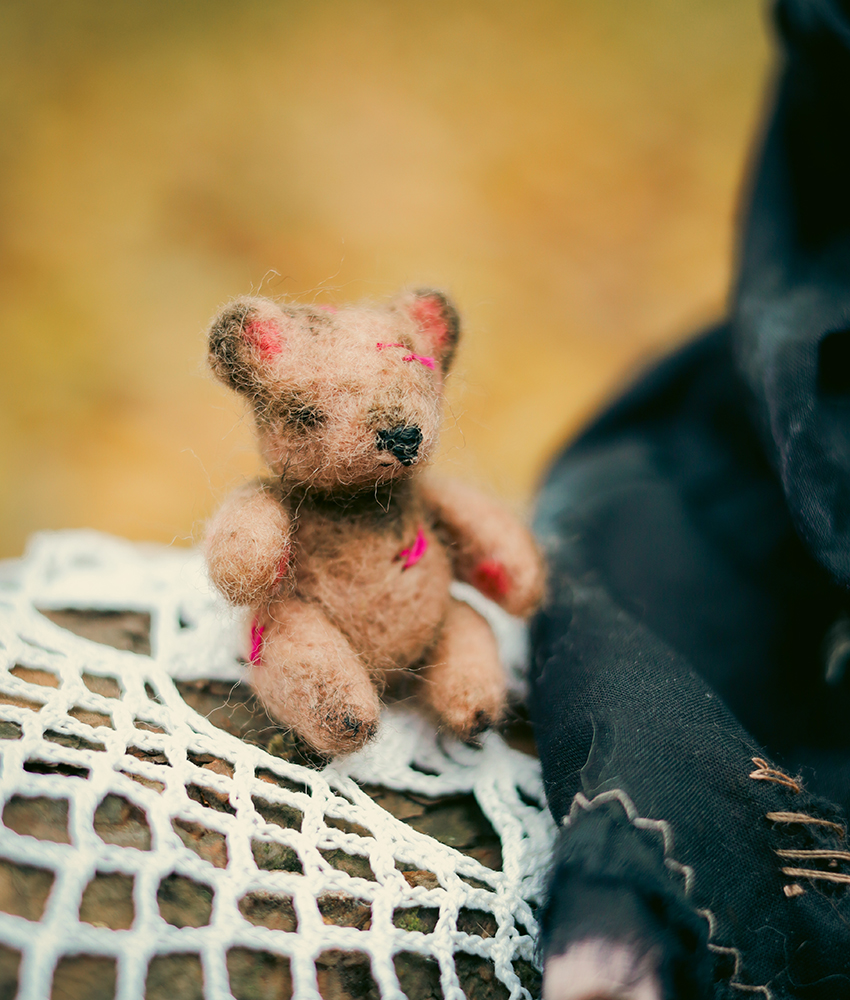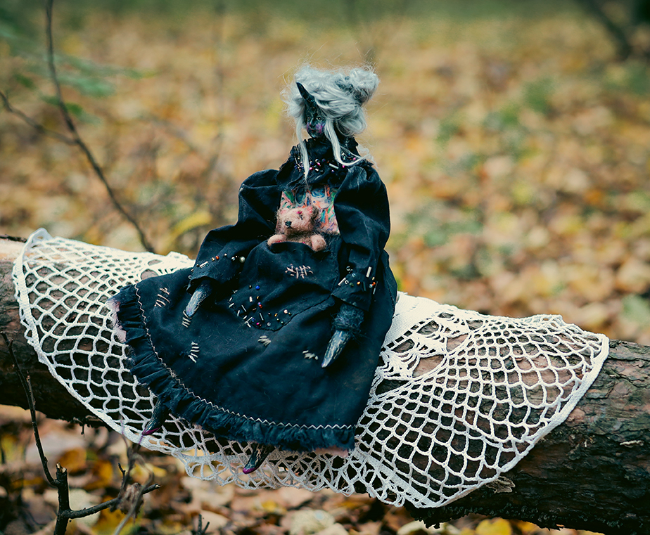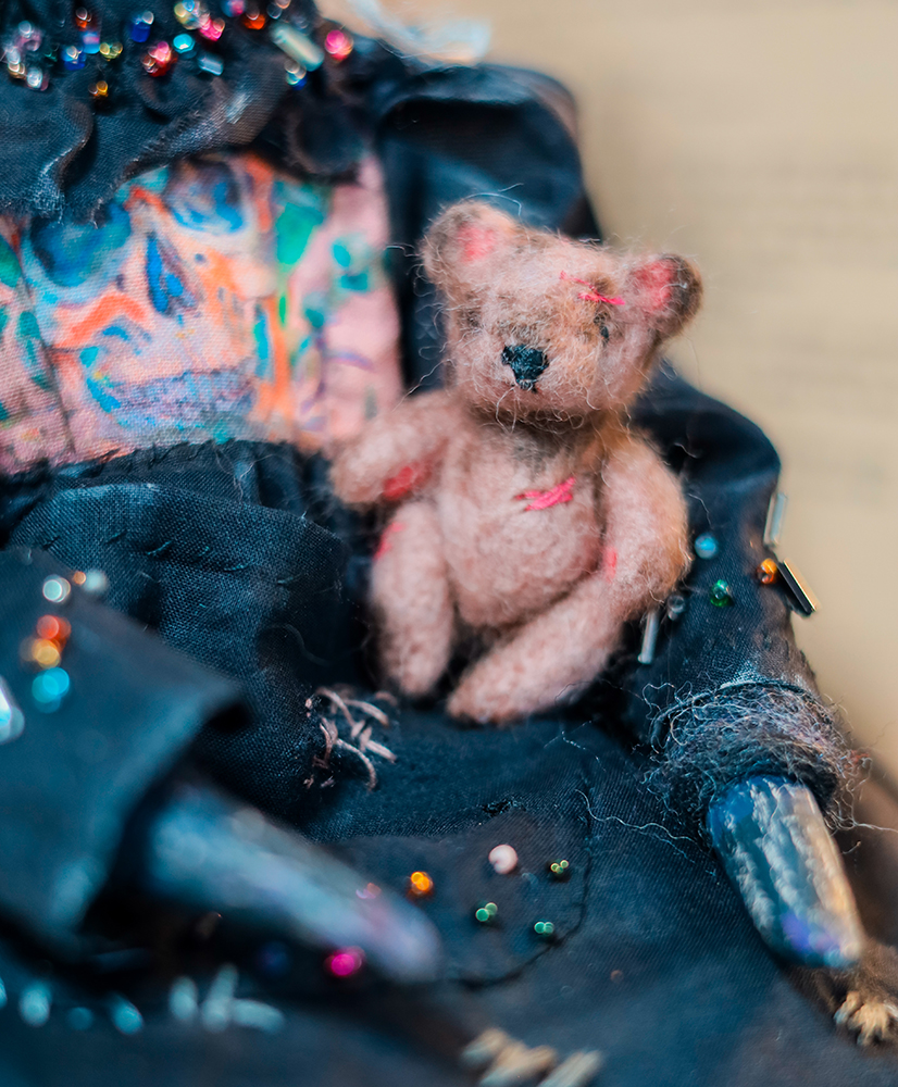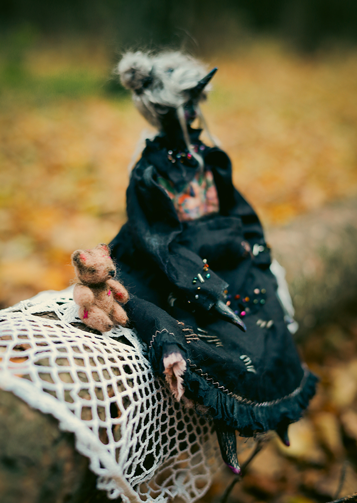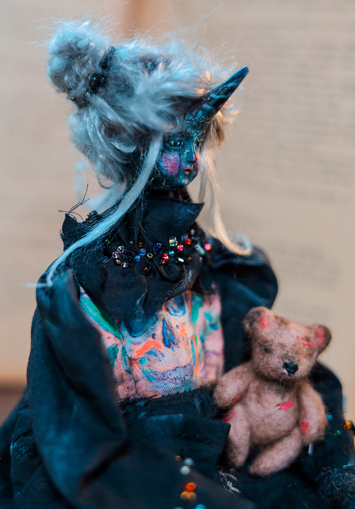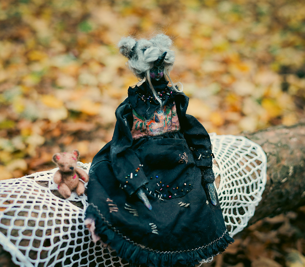 December 25, 2025A one-of-a-kind black unicorn witch doll, dressed in a timeworn black gown with delicate bead embroidery. Her dress carries subtle marks of age, while a tiny, well-loved teddy bear rests in her front pocket — a constant companion through shadows and quiet nights.