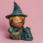 Handcrafted from paper mache, wool, and textiles, this doll embodies gothic romance and the haunting elegance of eternal midnight. She sits on a hand-painted base decorated with pumpkins and stars, enhancing her otherworldly presence.