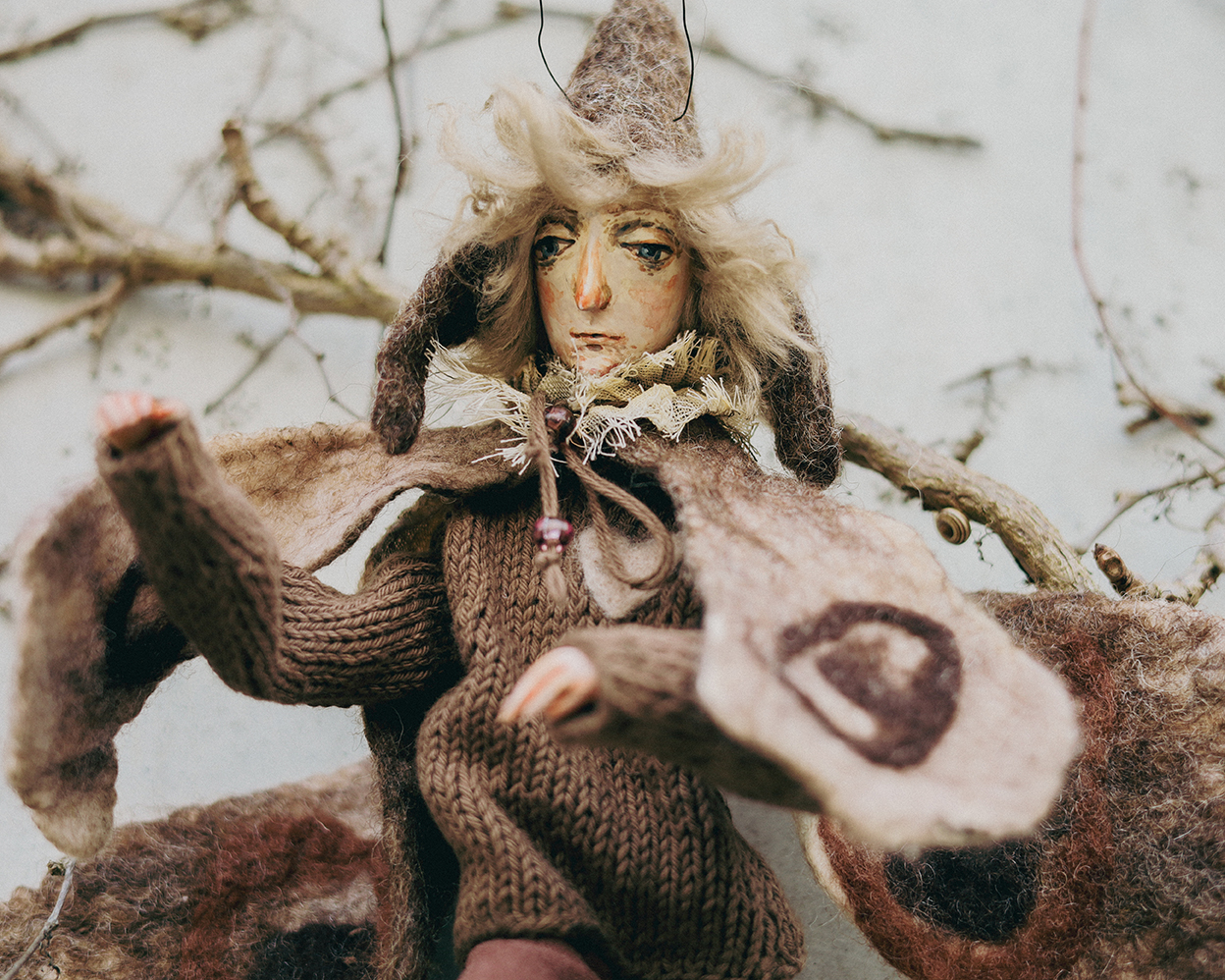 The doll is sculpted from self-hardening clay and textile over a wire armature. Arms and legs are movable, allowing gentle repositioning and subtle changes of posture. It can hang on a wall or sit on a shelf, as if resting after flight.