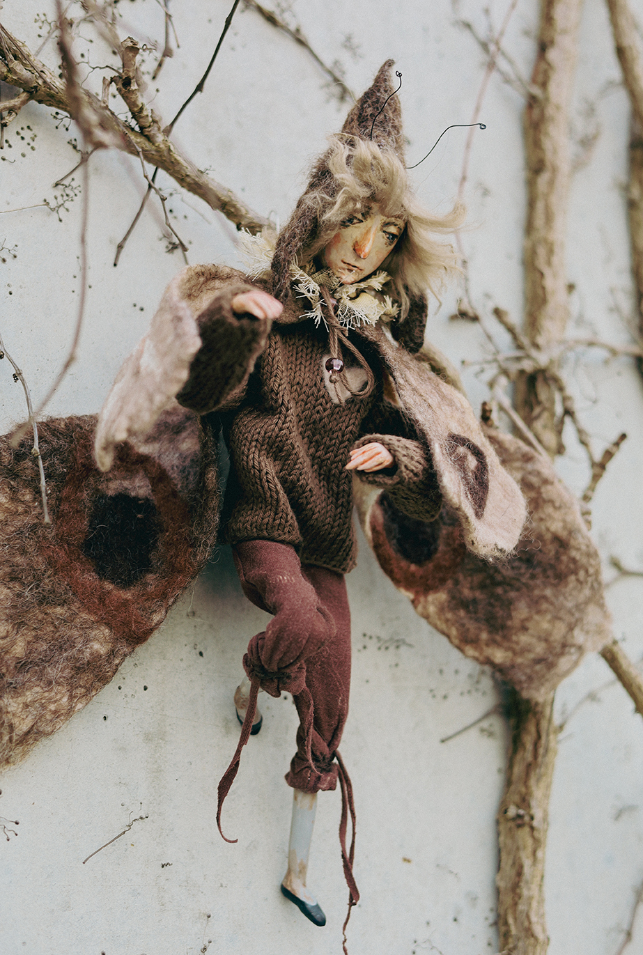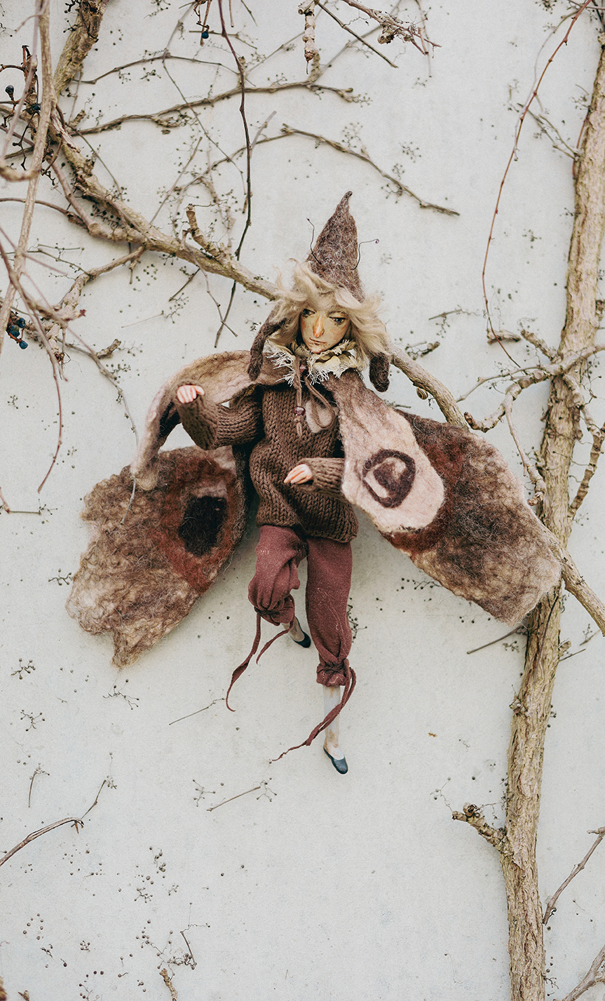 The face is individually sculpted and hand-painted. The felted wings are soft yet structured, layered in natural earth tones inspired by forest moth patterns. No molds are used. Each element is shaped and assembled by hand — this piece will never be repeated.