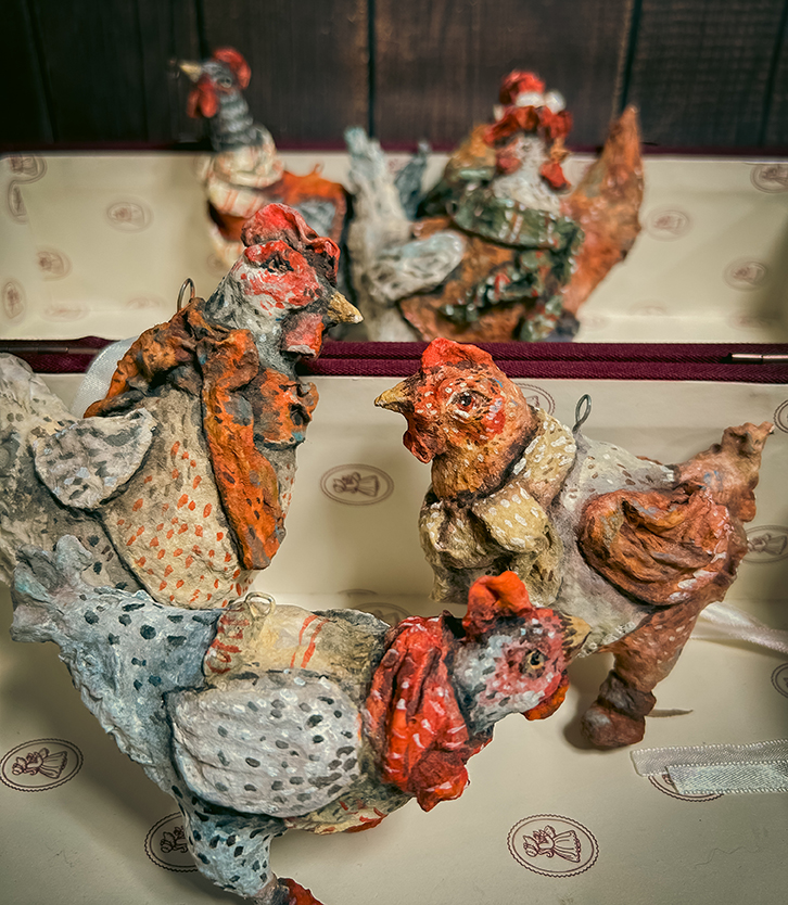 Warm and full of character, this hen wears her winter best — a patterned scarf and weathered red boots. Hand-painted in golden amber tones, she evokes the charm of old European holiday décor.