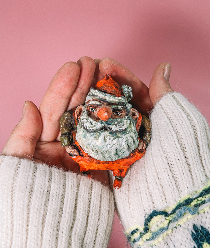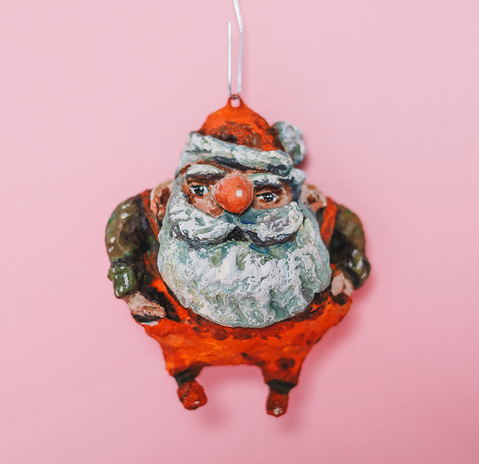 This one-of-a-kind Santa ornament is lovingly handcrafted from spun cotton and painted with acrylics, capturing the warmth of vintage holiday decor.