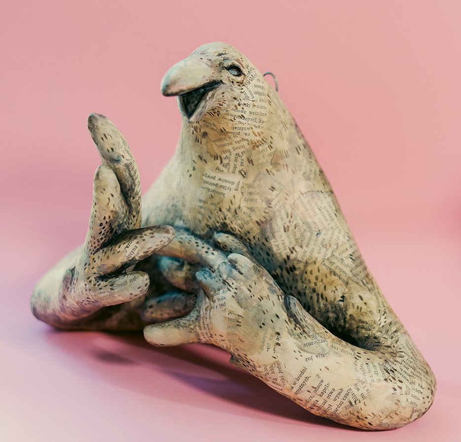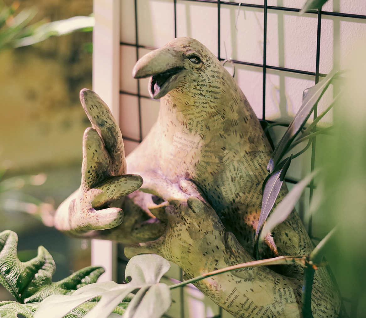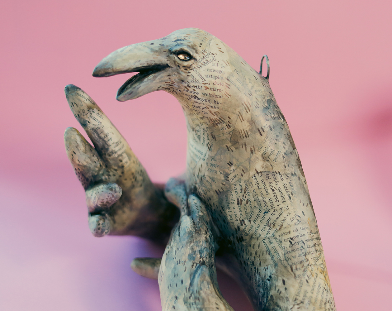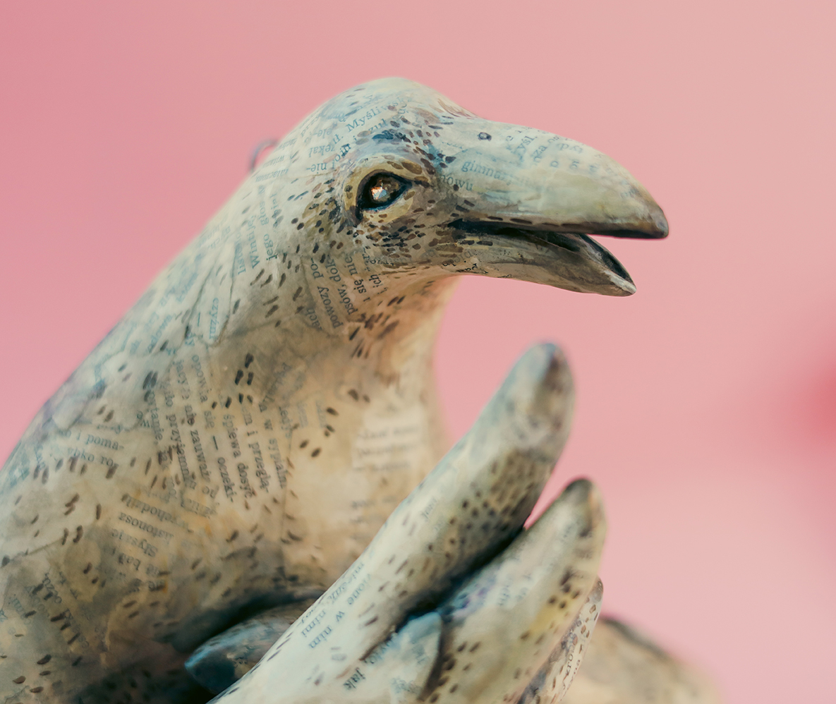 The White Crow is a one-of-a-kind wall sculpture, handcrafted from paper mache and layered with vintage book pages, hand-painted with acrylics, and sealed with varnish for durability.