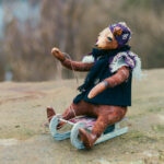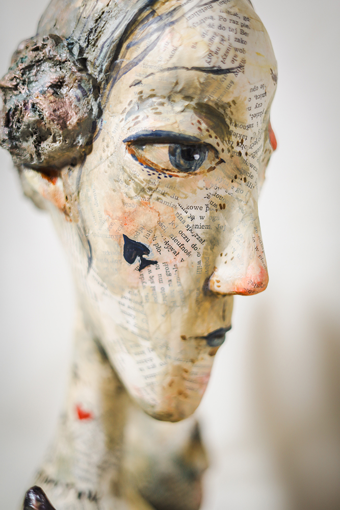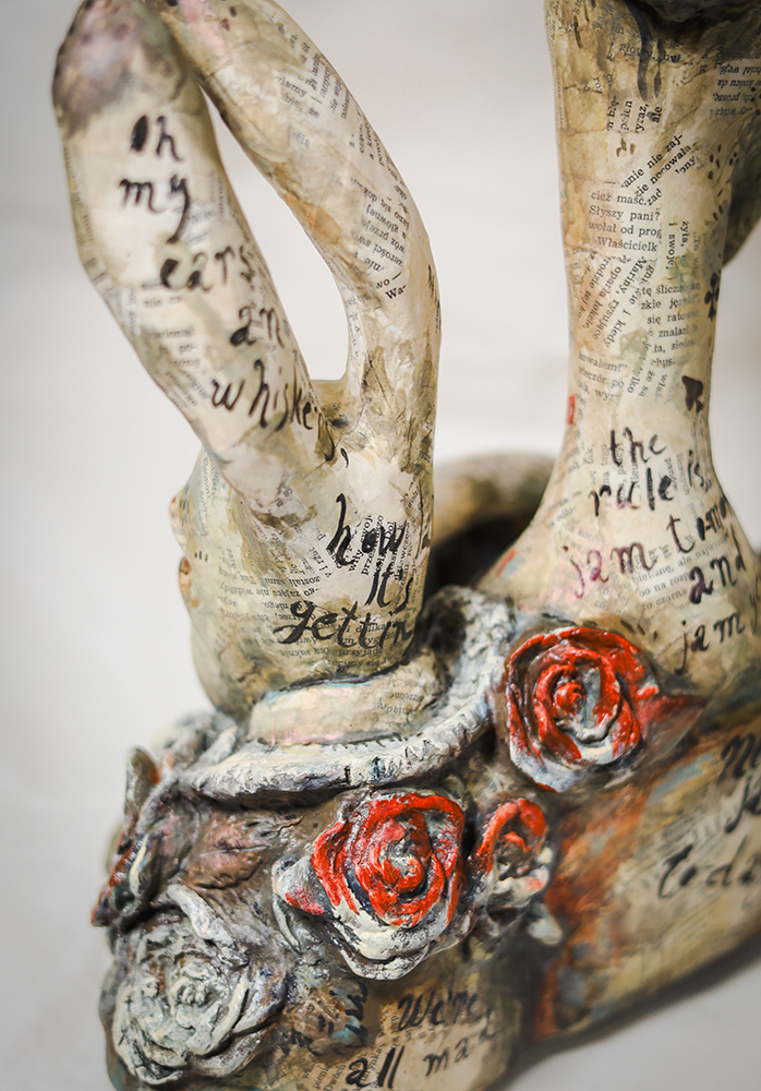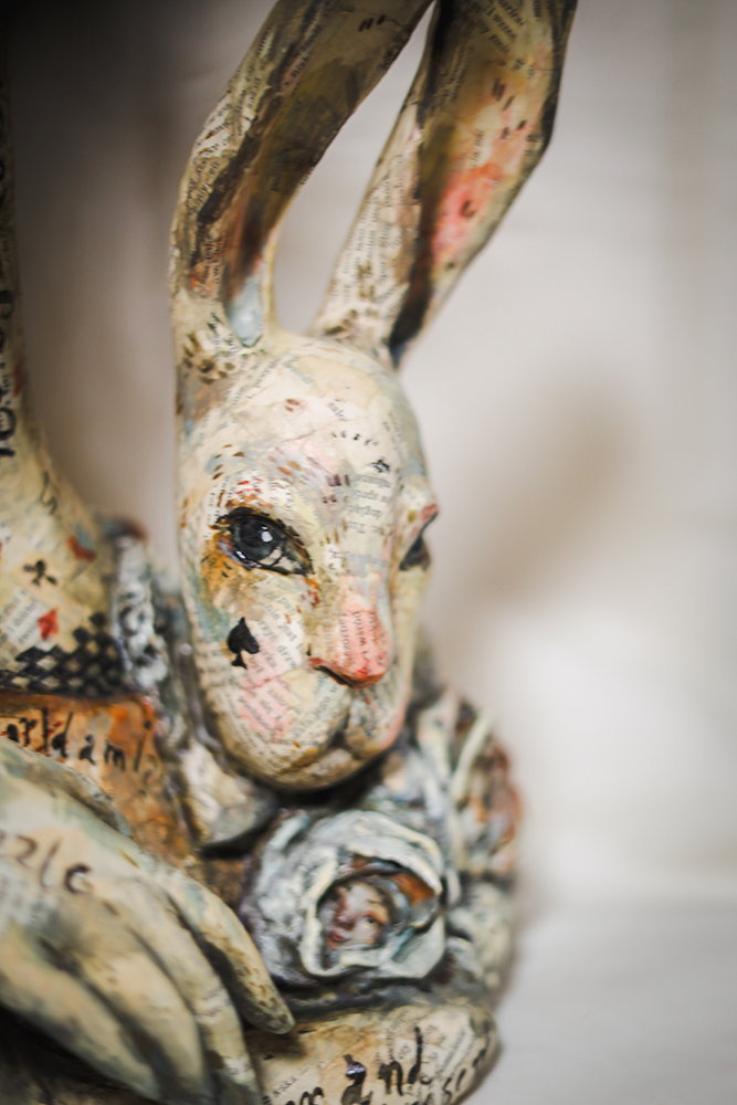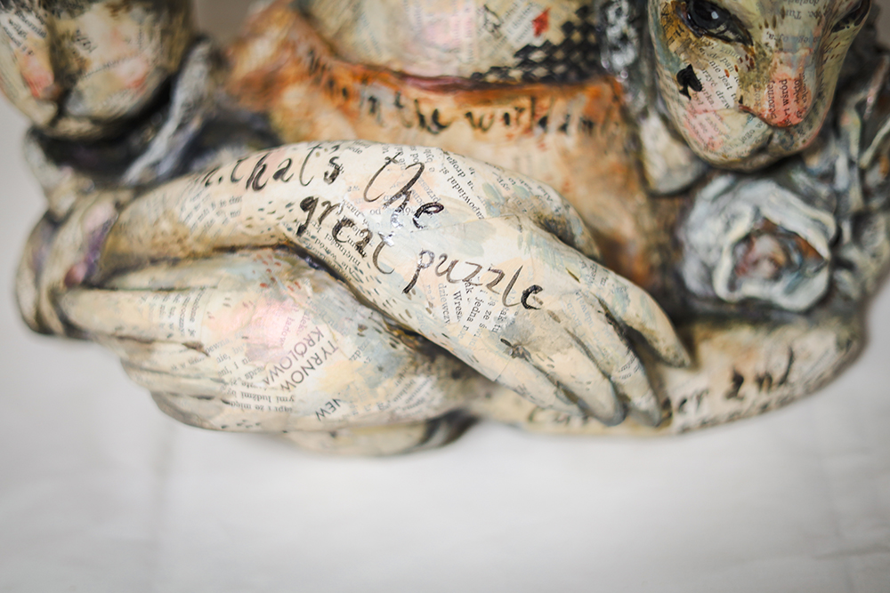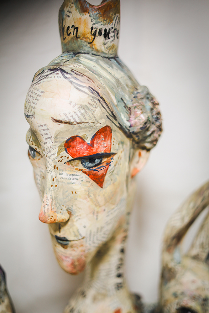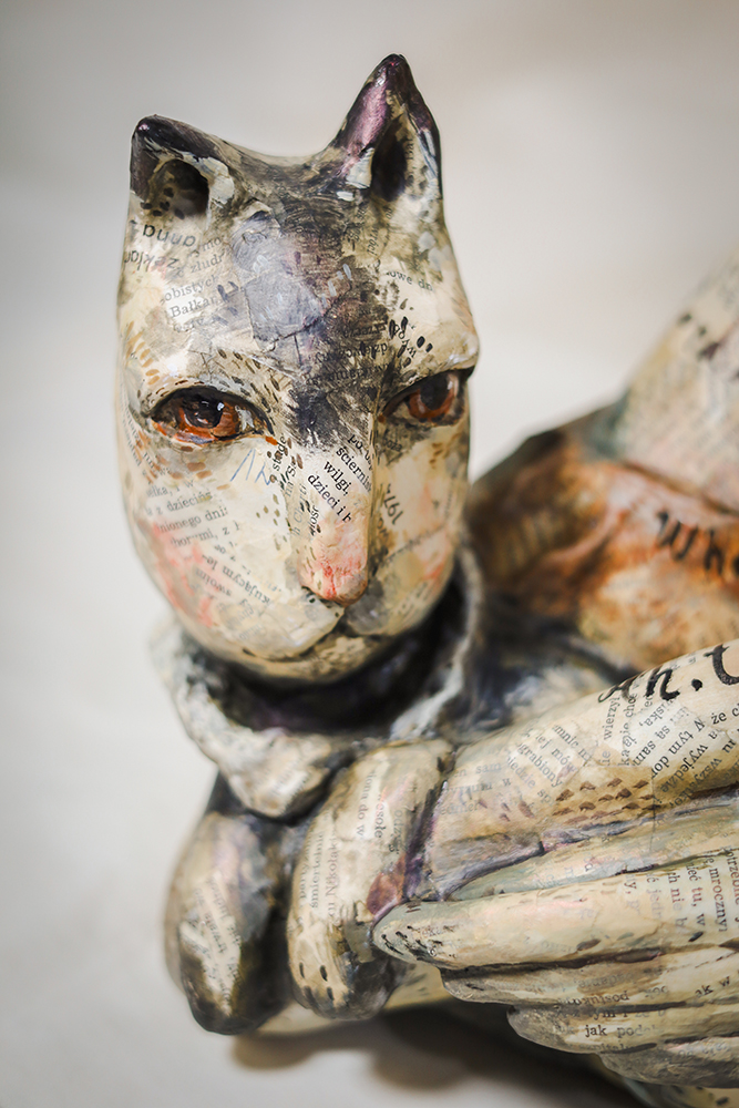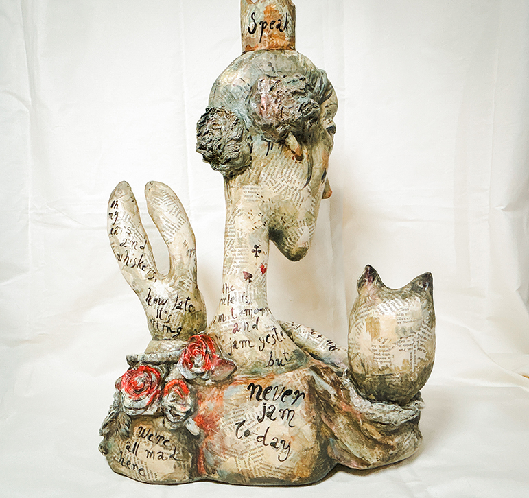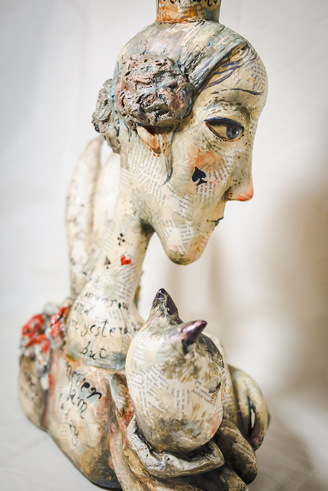 “Queen of Nonsense with Rabbit and Cat” is a narrative sculpture about a ruler who is made entirely of words. Fragments of vintage book pages turn into her skin, dress and crown, as if language itself has become a fragile armour.
