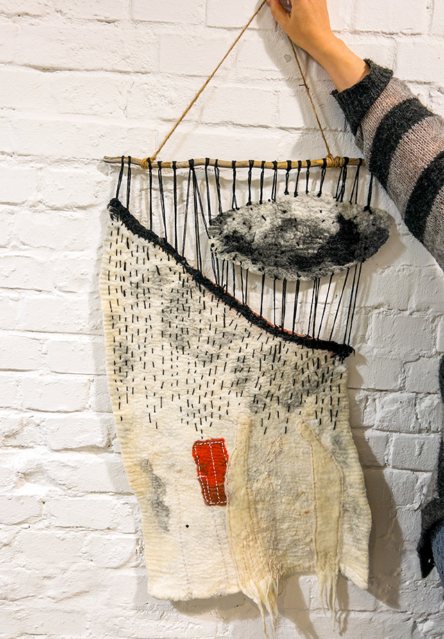 Medium: Wool, wet felting, needle felting, hand embroidery, mixed fibers, natural wooden branch