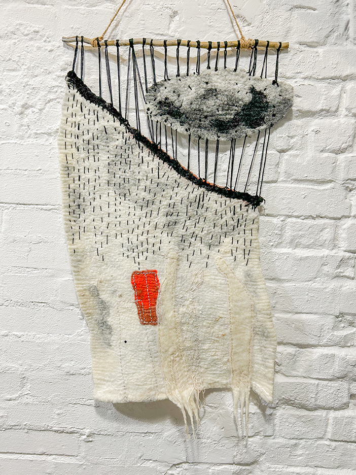 Suspended from a natural branch, a dark, textured cloud hovers above a field of felted wool. Tensioned black threads connect cloud and ground like lines of rain, while beneath them the outline of a house emerges through stitched markings and ghost-like forms. A bright red rectangle – part window, part door – pulses as a small core of warmth.